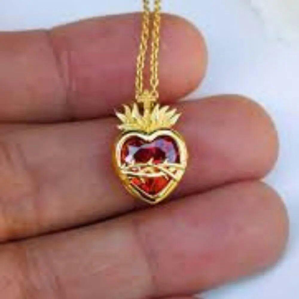 Dije: Corazón rojo con espinas, llamas y cruz superior.